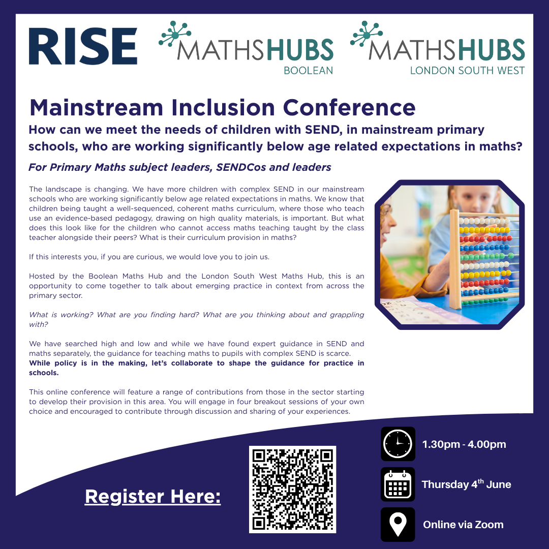 Hosted by the Boolean Maths Hub and the London South West Maths Hub, this is an opportunity to come together to talk about emerging practice in context from across the primary sector.